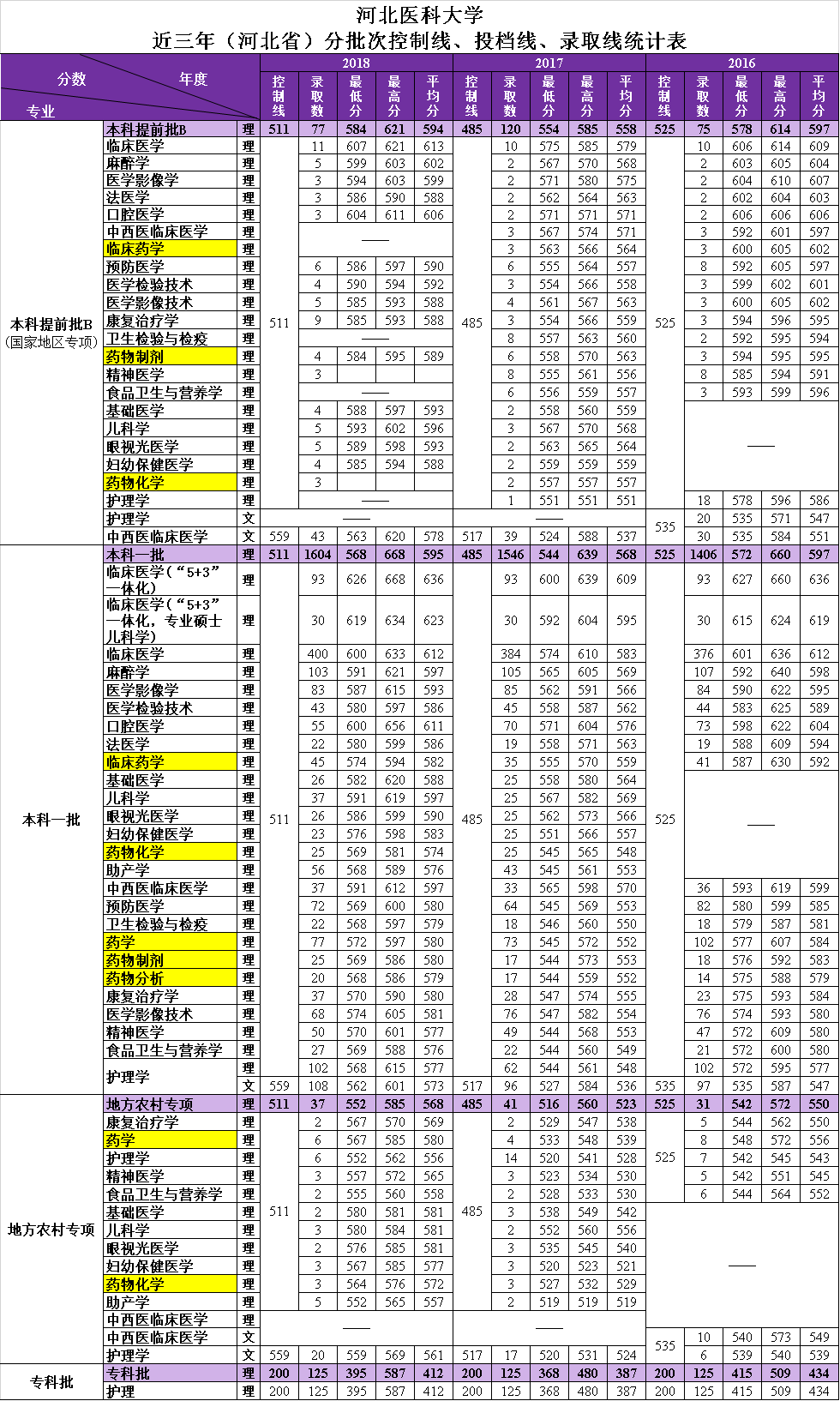 2016-2018年河北省各专业录取统计表