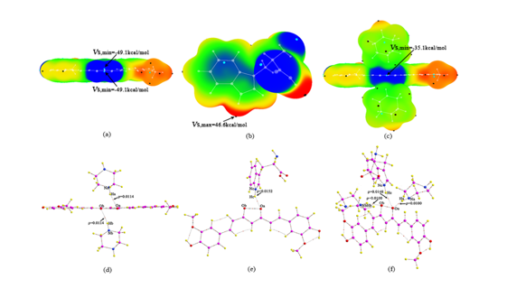 Fig.1 The electrostatic potentials on the 0.001 a.u. contour of the molecular electron density for (a) CUR; (b) tryptophan; (c) CUR-piperazine complex; and the molecular graphs for (d) CUR-piperazine complex; (e) tryptophan-CUR; (f) tryptophan-CUR-piperazine
