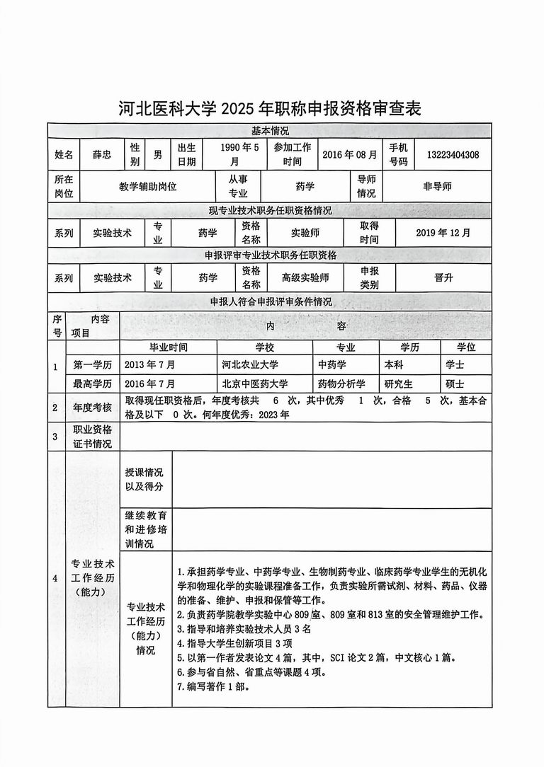 专业技术职务任职资格情况一览表-薛忠