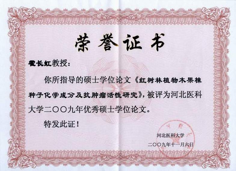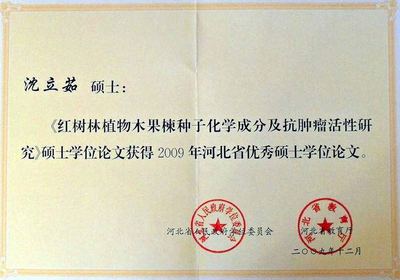 近日接我校研究生院通知:根据《河北省人民政府学位委员会关于做好河北省2009年优秀硕士学位论文评选工作的通知》,经专家组评议及公示,我室教师霍长虹副教授指导的05级硕士研究生沈立茹撰写的论文《红树林植物木果楝种子化学成分及抗肿瘤活性研究》被评为188bet金宝博 2009年优秀硕士学位论文、2009年河北省优秀硕士学位论文。