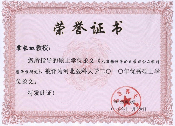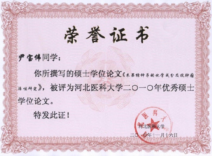 我室霍长虹教授指导的硕士研究生尹宝伟的学位论文《木果楝种子的化学成分及抗肿瘤活性研究》,被评为188bet金宝博 2010年优秀硕士学位论文。