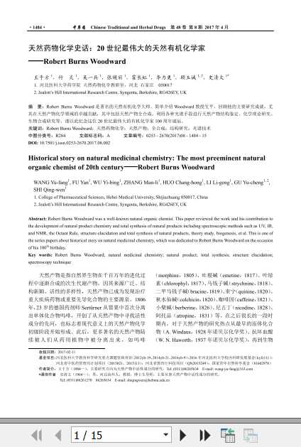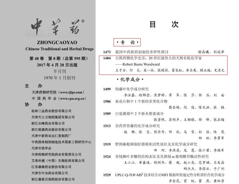 《天然药物化学史话:20世纪最伟大的有机化学家——R. B. Woodward》(本室编写)
