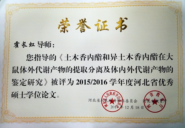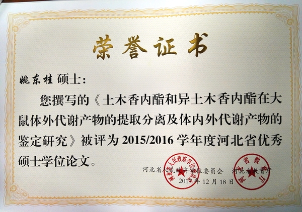 由我室 霍长虹 教授指导的2013级硕士研究生姚东桂撰写的毕业论文《土木香内酯和异土木香内酯在大鼠体外代谢产物的提取分离及体内外代谢产物的鉴定研究》被评为188bet金宝博 2015-2016学年度优秀硕士学位论文、河北省优秀硕士学位论文。