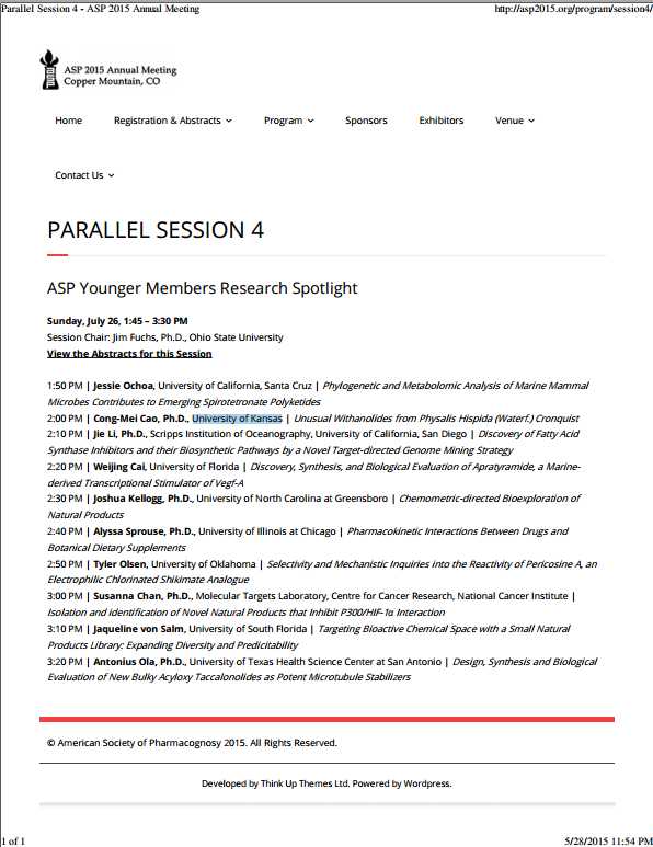 我室培养的研究生?聪梅受美国化学会生药学会年会(American Society of Pharmacognosy 2015 Annual Meeting)邀请参会,并被列为杰出青年研究者在大会做研究报告(详见:),也被评为著名国际学术出版集团Elsevier的杰出审稿人(Outstanding Reviewer)。